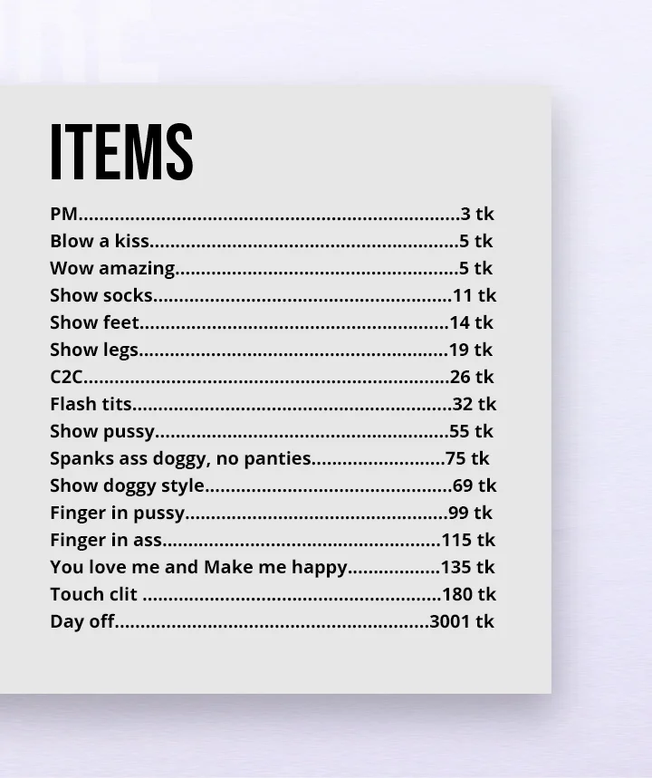Mistress, Erotic Dance, Fingering, Flashing, Heels, Doggy Style, Spanking, Dirty Talk, Striptease, Humiliation, Foot Fetish, Deepthroat, Jerk-off Instruction, Role Play, Orgasm, Oil Show, Topless, Twerk